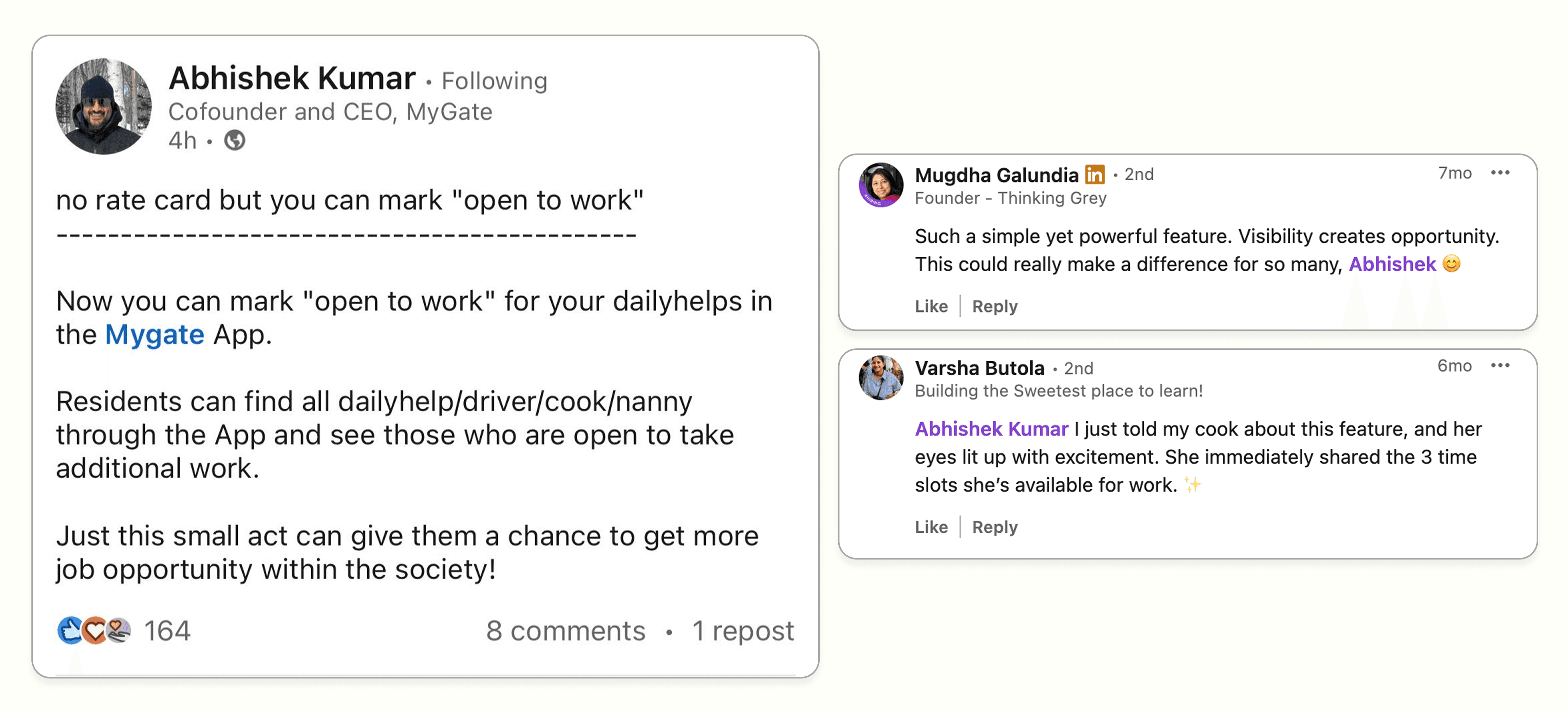 MyGate’s Co-founder announced the feature on LinkedIn proof that small ideas can create real community change.